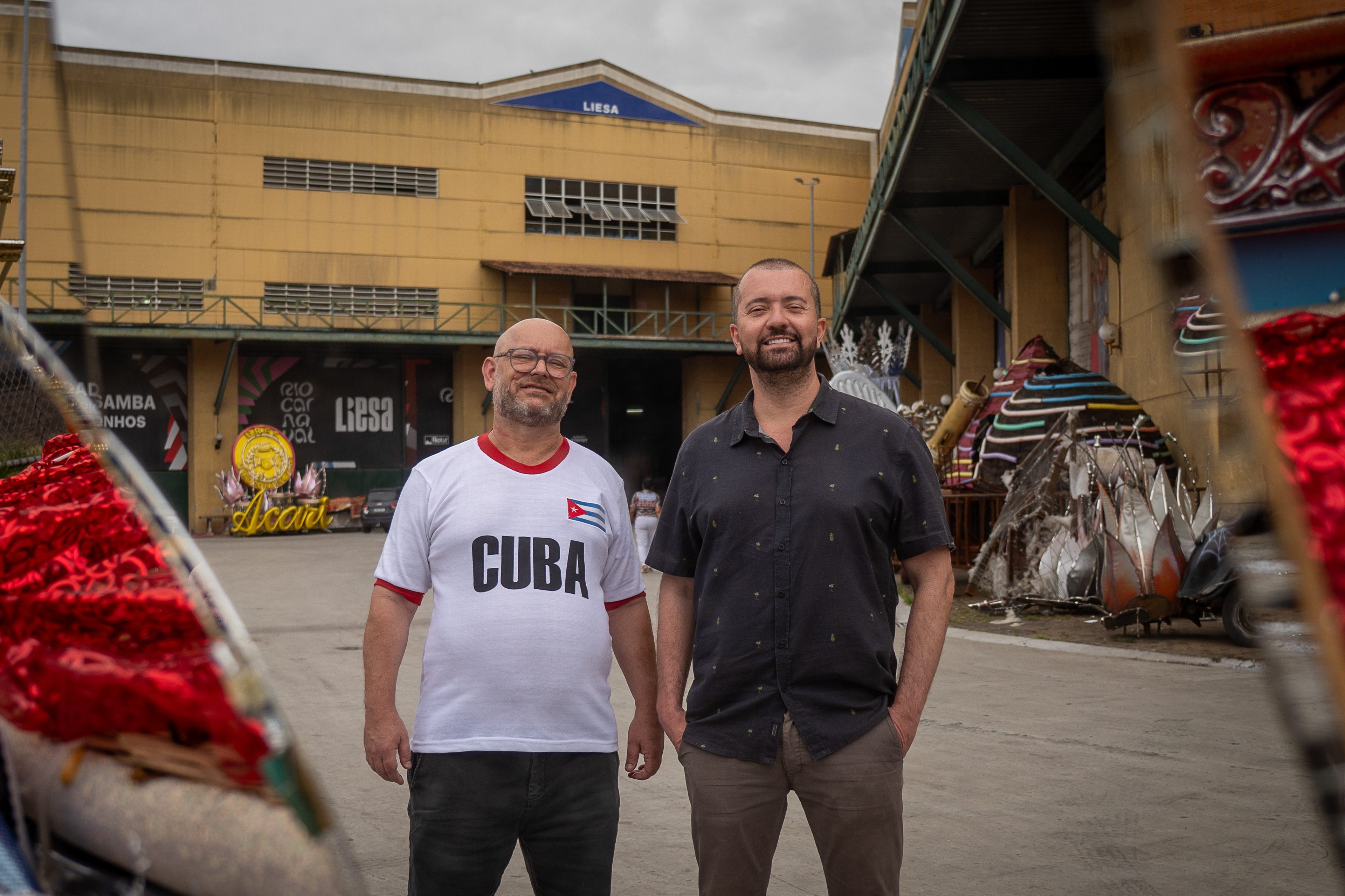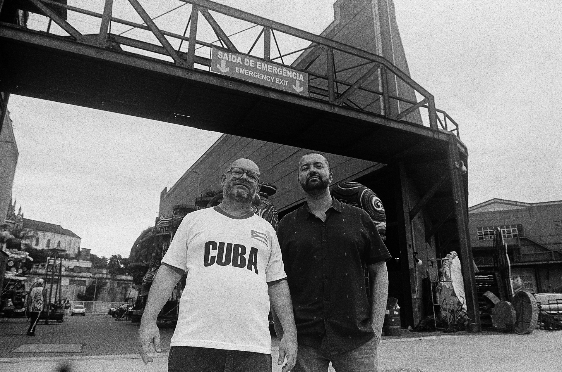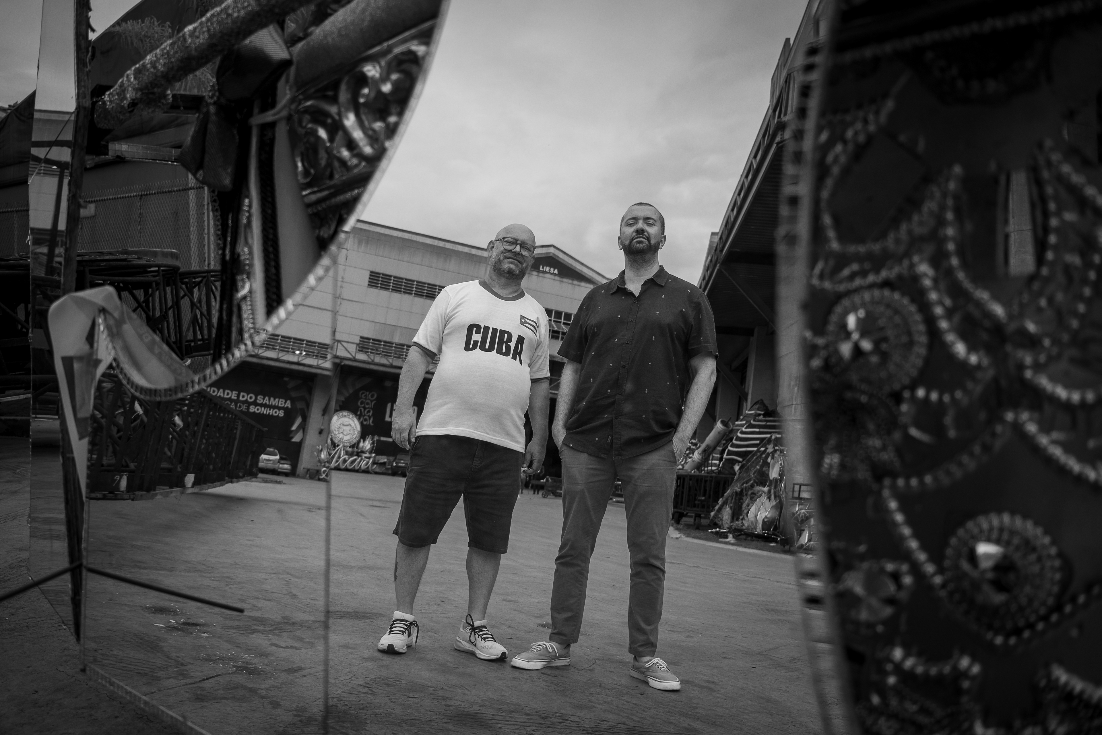 era um carro antigo, de desfiles passados. com suas milhares de miçangas, suas ferragens, suas memórias descansando o sono dos sonos e os materiais espelhados, peças únicas reverberando a galera que passava prum lado e pro outro na cidade do samba. e de sonhos. sempre de algum sonho. rodamos um pouco por lá, entre a primeira e última foto. gosto desse jogo de espelho entre fotógrafo, fotografados, ângulos e sombras, um mundo inclinado e uma moldura de adereços que vão se perdendo e se perdendo nas laterais da imagem. gosto também da saída de emergência. os dois perfilados. um homem que caminha calmamente ao fundo. as construções. as muitas e muitas ferragens. sempre ferragens. outro carro atrás. outros carros estacionados de um mundaréu de gente que segue trabalhando nesse quase-delírio, mas que no chão e nas calçadas e nas praças vira projeto, em direção a um existir que finalmente passe a 'dar errado'. sigo com os ensinamentos que no final das contas, nessa cultura de brechas, fresteira, cada pequeno poro eriçado, suando à contra-pelo, é uma saída de emergência, um plano desviante e insurgente. viva @fabiofabato. viva @luizantoniosimas. viva @morula_editorial. viva @vitor.m.castro.