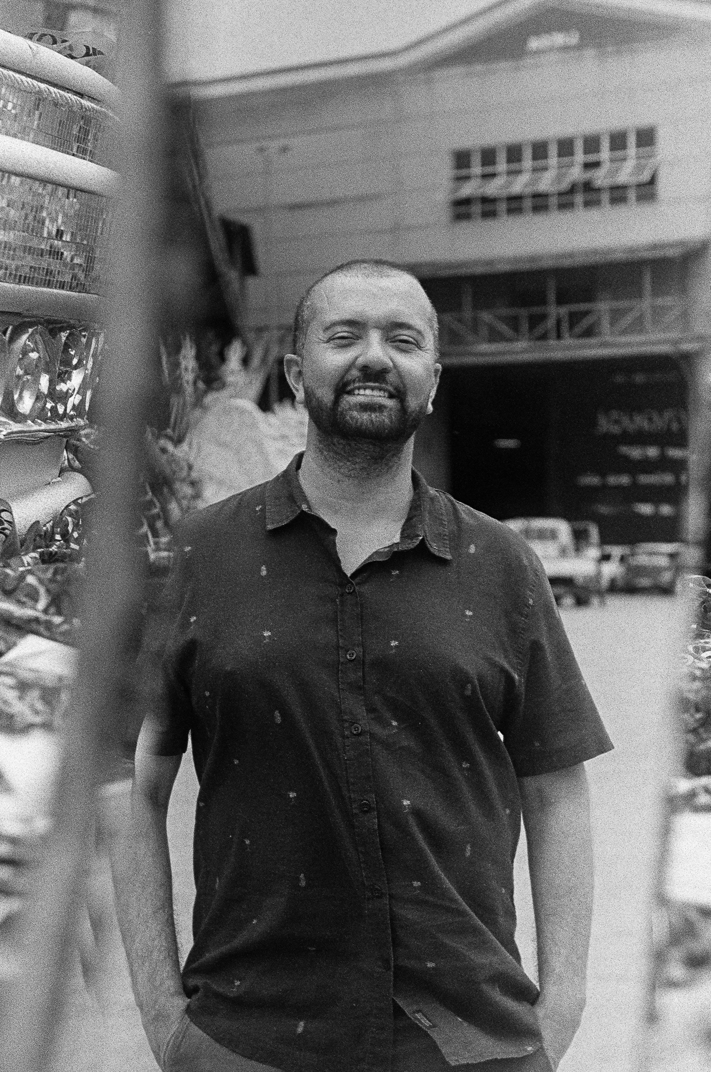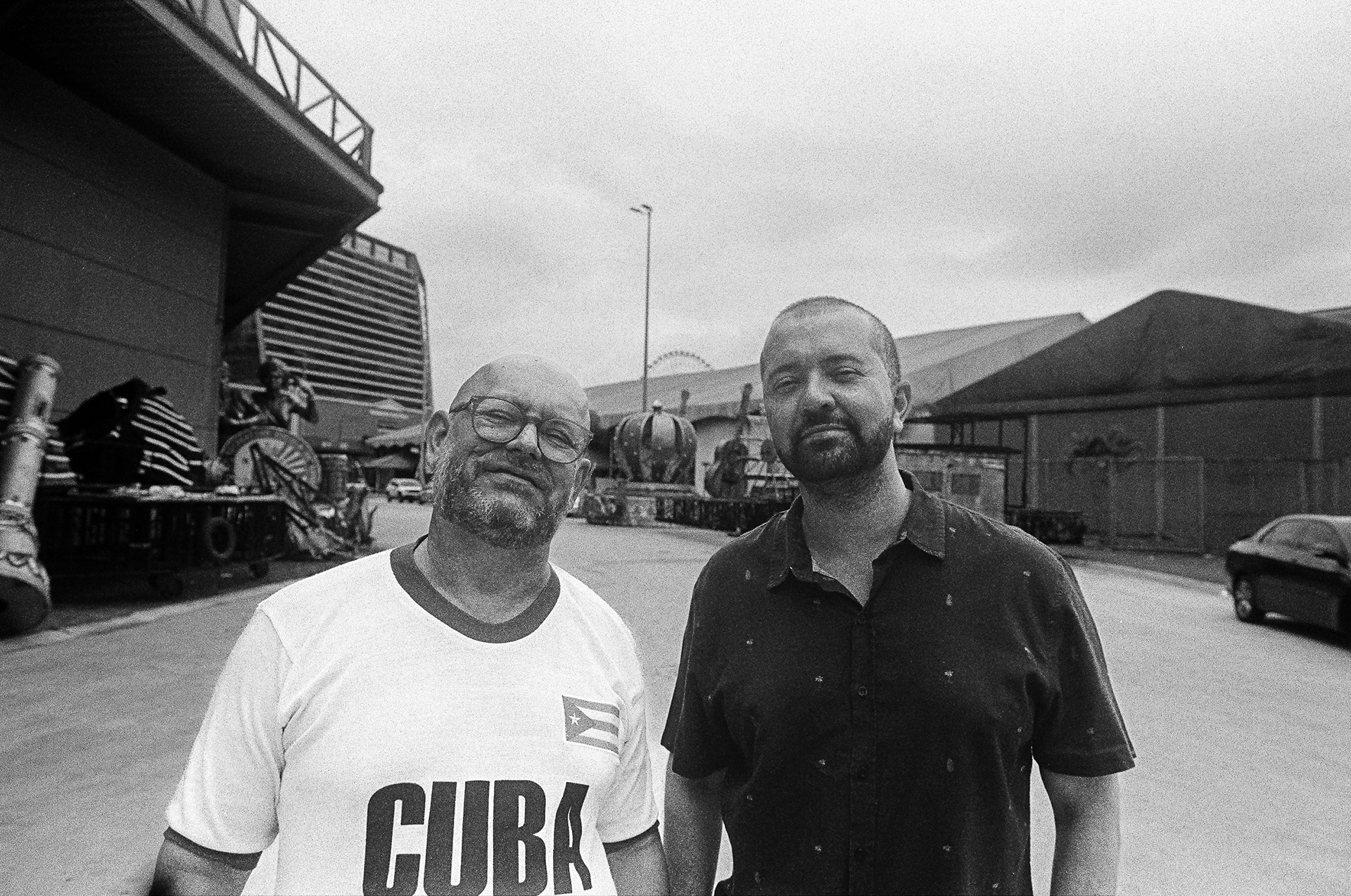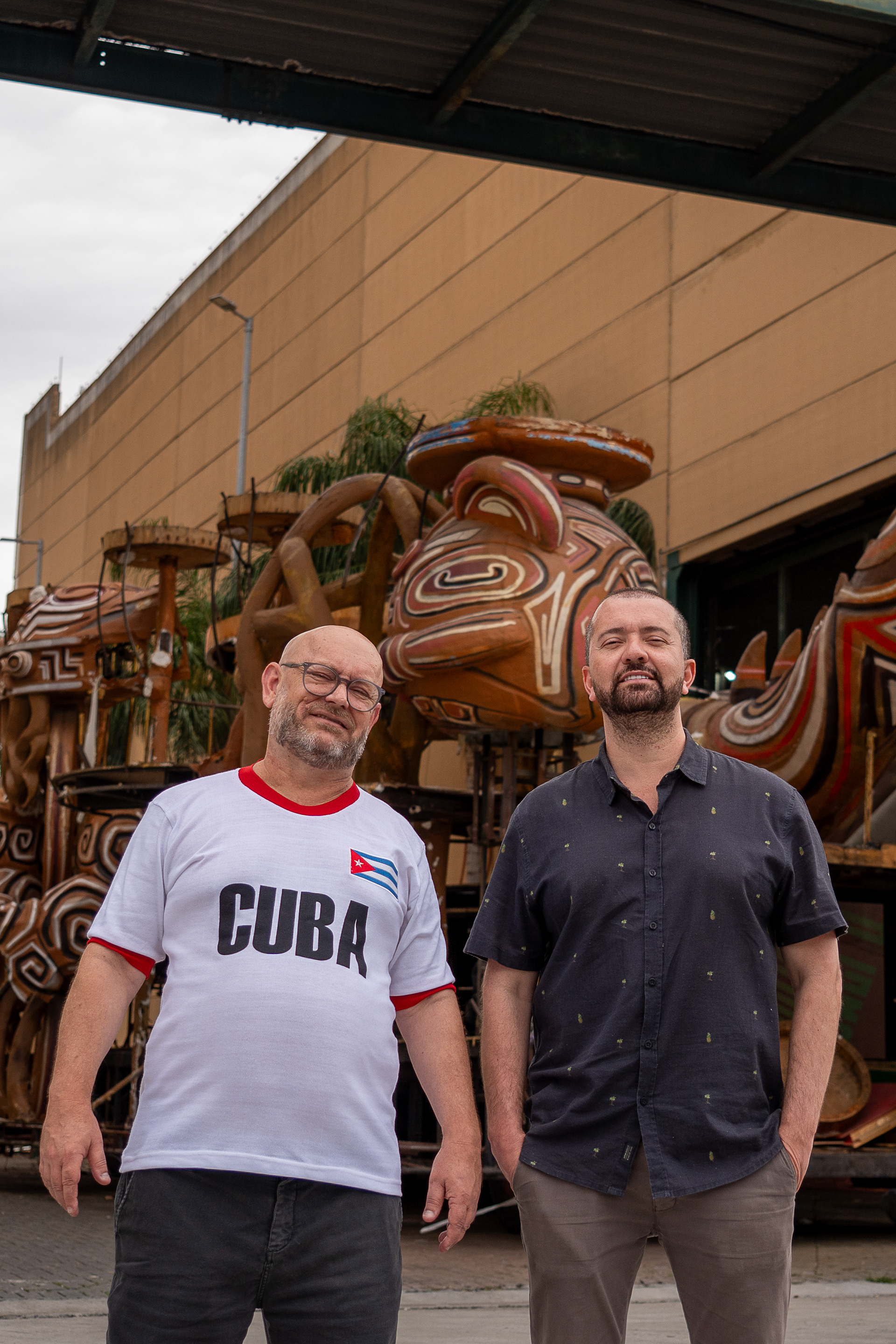 era um carro antigo, de desfiles passados. com suas milhares de miçangas, suas ferragens, suas memórias descansando o sono dos sonos e os materiais espelhados, peças únicas reverberando a galera que passava prum lado e pro outro na cidade do samba. e de sonhos. sempre de algum sonho. rodamos um pouco por lá, entre a primeira e última foto. gosto desse jogo de espelho entre fotógrafo, fotografados, ângulos e sombras, um mundo inclinado e uma moldura de adereços que vão se perdendo e se perdendo nas laterais da imagem. gosto também da saída de emergência. os dois perfilados. um homem que caminha calmamente ao fundo. as construções. as muitas e muitas ferragens. sempre ferragens. outro carro atrás. outros carros estacionados de um mundaréu de gente que segue trabalhando nesse quase-delírio, mas que no chão e nas calçadas e nas praças vira projeto, em direção a um existir que finalmente passe a 'dar errado'. sigo com os ensinamentos que no final das contas, nessa cultura de brechas, fresteira, cada pequeno poro eriçado, suando à contra-pelo, é uma saída de emergência, um plano desviante e insurgente. viva @fabiofabato. viva @luizantoniosimas. viva @morula_editorial. viva @vitor.m.castro.