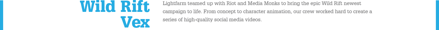 From concept to character animation, our crew worked hard to create a series of high-quality videos for Riot's game, Wild Rift.